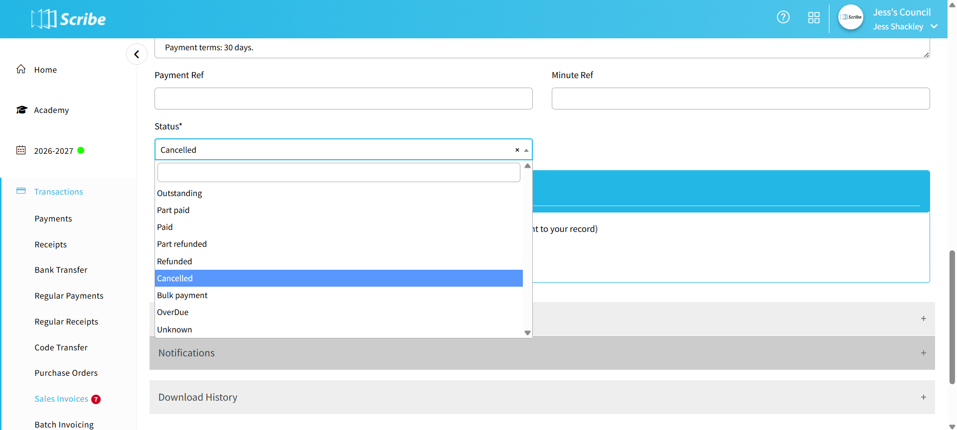 - Amend the Status of the invoice to 'Cancelled'.