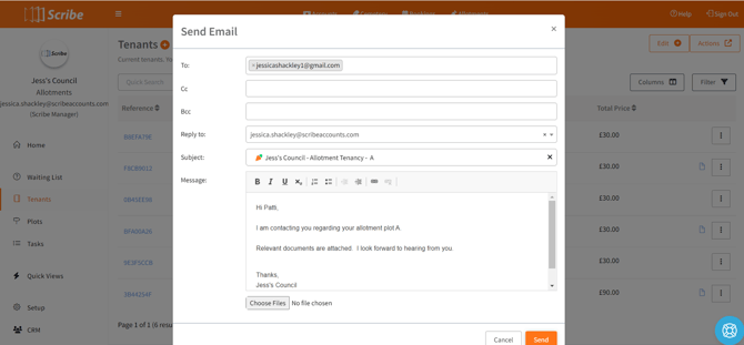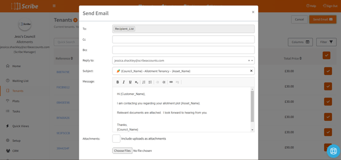 The email address of the applicant will be copied from the CRM database and a template email will be generated. Here you can check the box to "Include attachments" that have been uploaded to your plot holders record before selecting Send.