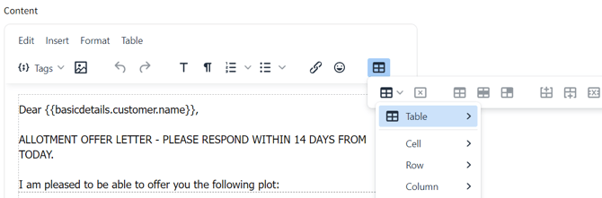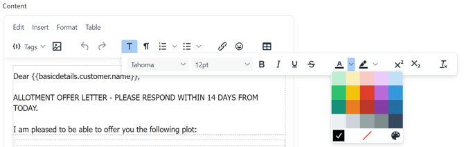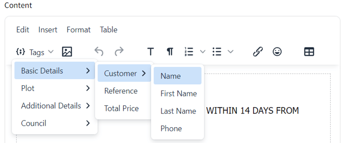 The templates support dynamic content, which is a bit like mail merge on Microsoft word. You have access to merge tags related to the record (like invoice data), and also general data, such as your council address (stored in your council profile).