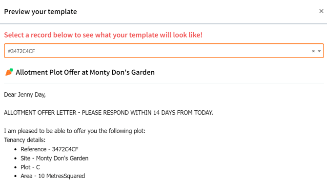 When you are happy with the changes to your template, AND HAVE RENAMED THE TEMPLATE select  where you can then preview your results by selecting a record.