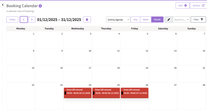 Calendar Views show bookings by different resources such as venue or customer.