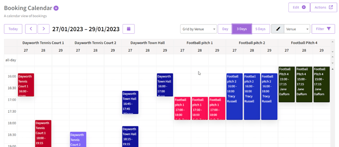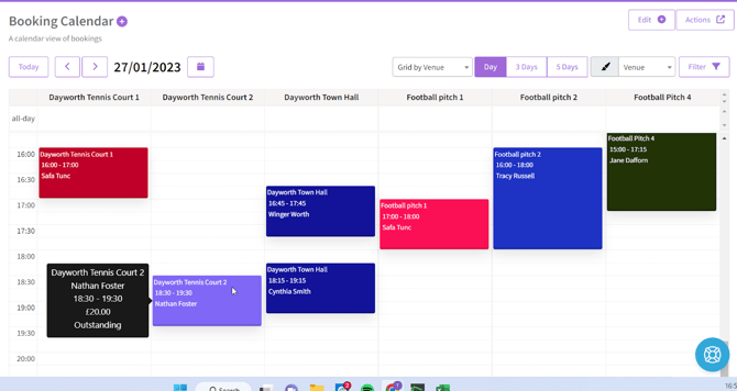 Grid by Venue - Shows each venue by column with the times along the left. Hovering the mouse over a booking will show the status of the booking