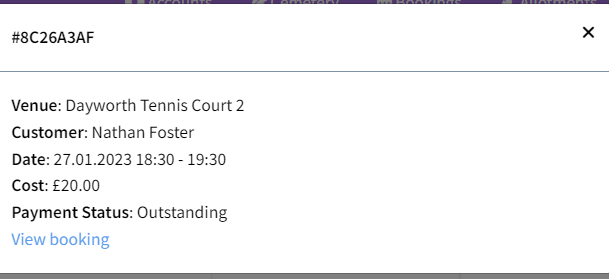 Clicking onto a booking will display the details with an option to view the booking in the main bookings page