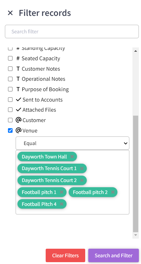 The "Filter" Records allows full filtering of the data displayed. For example, you can choose to select which Venue/s to display by making your own selections