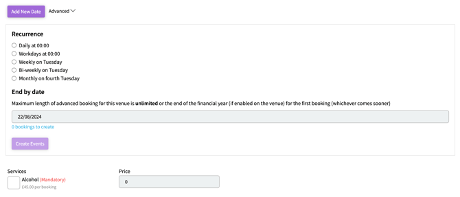 Click on 'create events' to schedule the series of bookings.