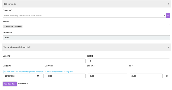 For additional dates, click "Add a new date" or for block bookings, use the advanced drop-down.