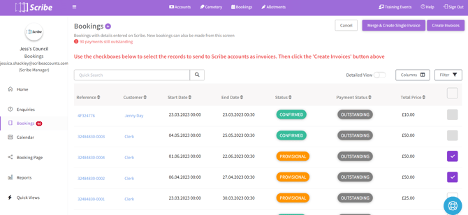 Where customers have bookings for different venues (e.g. one football team hiring out multiple pitches) or multiple customers hire the same venue but are under the same organisation (e.g. different football teams of the same club), you can now create one invoice for multiple bookings records.