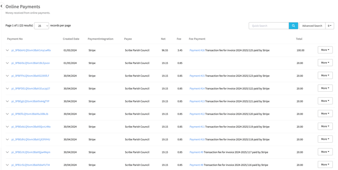 This lists all online payments, the fee and the link to the payment record. Contains all the additional information needed for bank reconciliation.