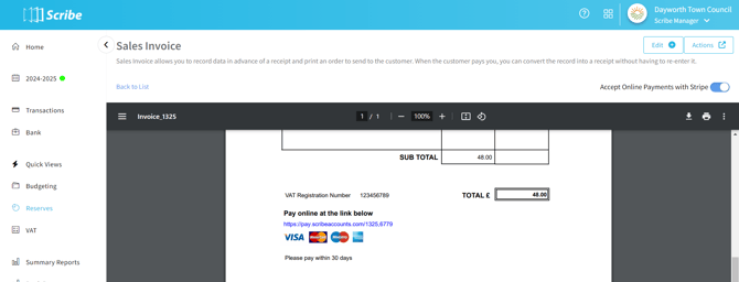 - Scribe - Receipt creation: Scribe generates a receipt in the cashbook for the full value of the invoice