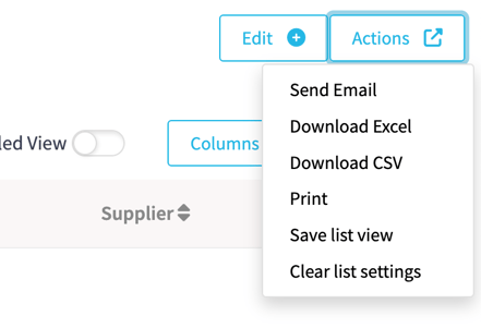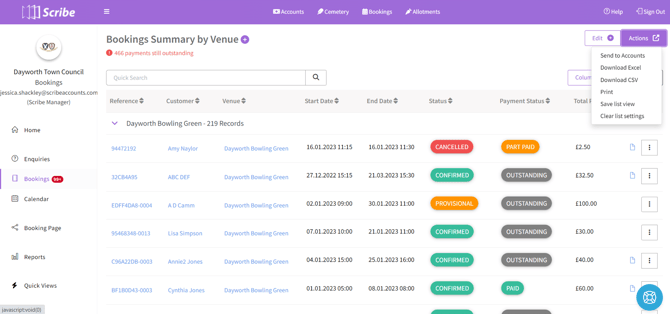 Any view which is either on display or saved under "Quick Views" can be exported or printed by selecting Actions in the top right hand corner.