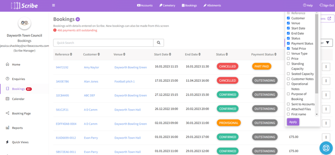 From list view eg. Bookings Menu, Select the Columns icon. Drag the columns to the order in which you wish for them to appear, the tick will indicate chosen columns, unticked will not appear. Select Apply and your chosen selection will appear.