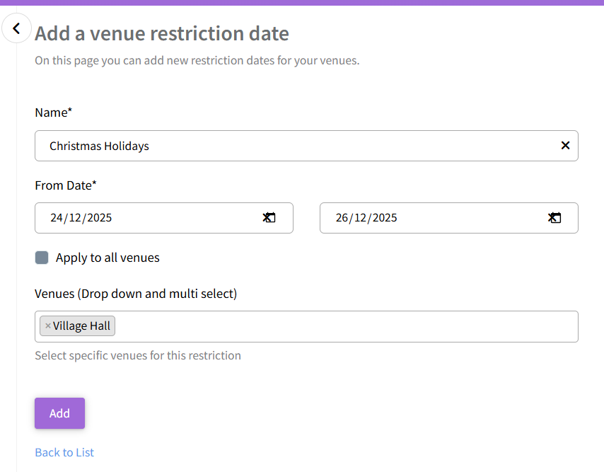 - Select 'Add'. Customers will then be unable to make online bookings for the specified dates.