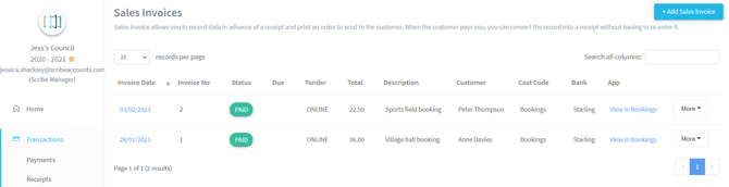 - If you go back to Transactions > Sales invoices, you will see the status has changed from 'Outstanding' to 'Paid'. You can also select 'View in Bookings' where you'll be able to change the status from 'Provisional' to 'Confirmed', if you have not already set the booking as paid.