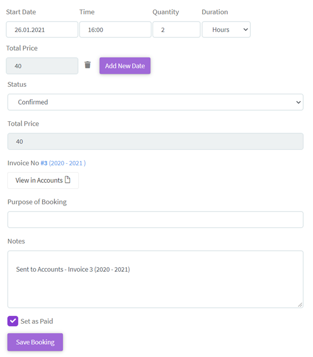 - Once saved, a blue icon will appear next to the booking invoiced, by clicking on this you'll be able to view the sales invoice in your accounts and download or share as you would any other sales invoice.