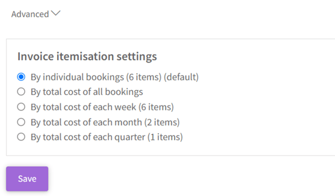 - Beneath Description, there is an "Advanced" Dropdown where if required you can make selections for invoice itemisation as below. The default option is set to 'By individual bookings'