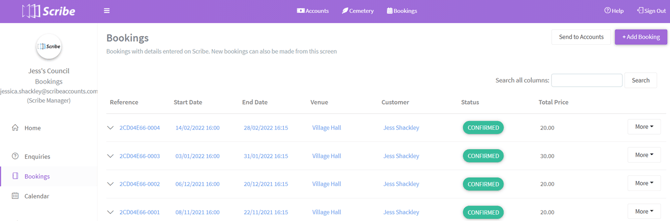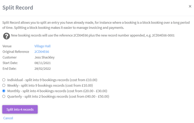 Where a record has more than one booking (e.g. a block booking has been created) you will have the option to split the record in order to make it easier to manage invoicing and payments.