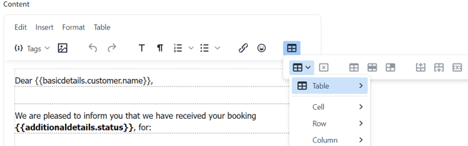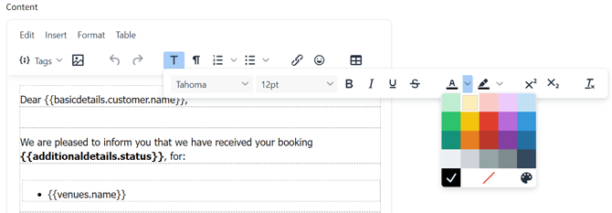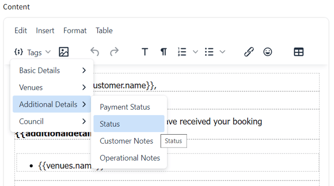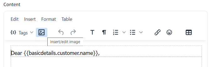 The templates support dynamic content, which is a bit like mail merge on Microsoft word. You have access to merge tags related to the record (like invoice data), and also general data, such as your council address (stored in your council profile).