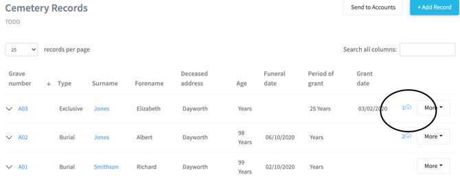 On the records home screen you will be able to see how many documents are attached to a burial record via the upload icon at the end of the record, by clicking the icon this will also take you to the documents record screen.