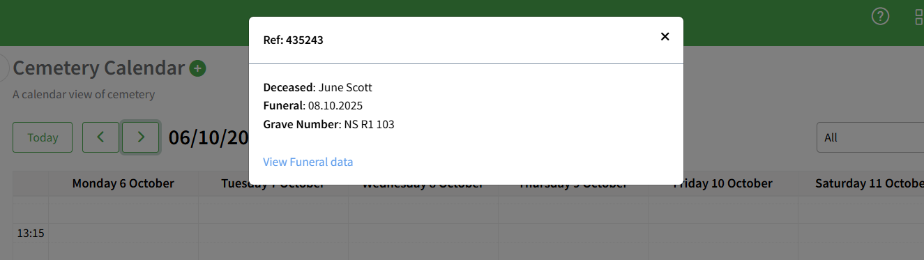 Clicking an existing record in the calendar will show you a summary of the information. Select View Funeral data to take you to the record to provide further details or make amendments.
