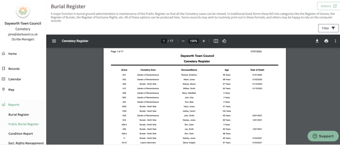 Scribe Cemetery accommodates these traditional methods by allowing all such registers to be generated from its database. The public burial removes personal details such as addresses so that the document can be made available to the Public Some councils may choose to routinely print these records, whilst others might find it more convenient to rely on the digital database.
